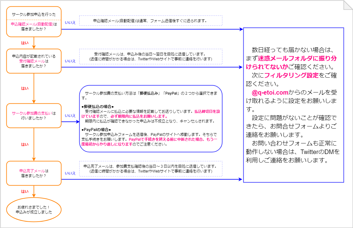 オンライン申込みの方で、フォーム入力後1週間経っても申込確認メール(自動配信)や受付確認メールが届かない方は、一度上記の確認をお願いいたします。
