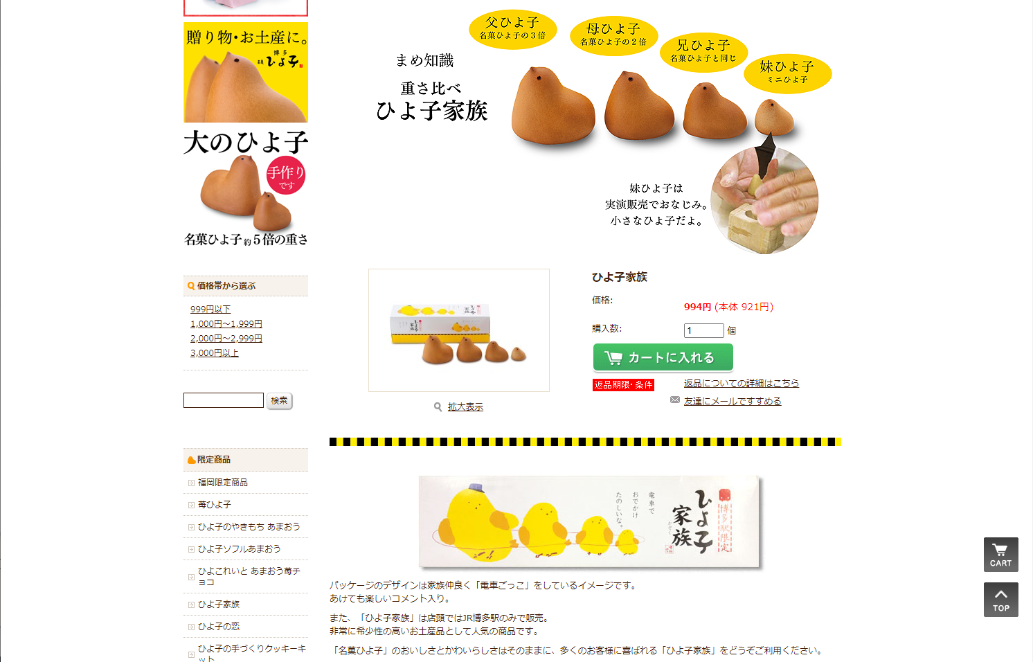 言わずと知れた定番お土産商品、ひよ子。 大小4つの、大きさの異なるひよ子を1つのBOXに詰めた【 ひよ子家族 】は、博多駅と通販でのみ購入できる商品です。 表面パッケージも可愛いのですが、箱の内部にも可愛いコメントが載っています。 食べて美味しい、見て可愛い、ほっこりとする商品です。 |